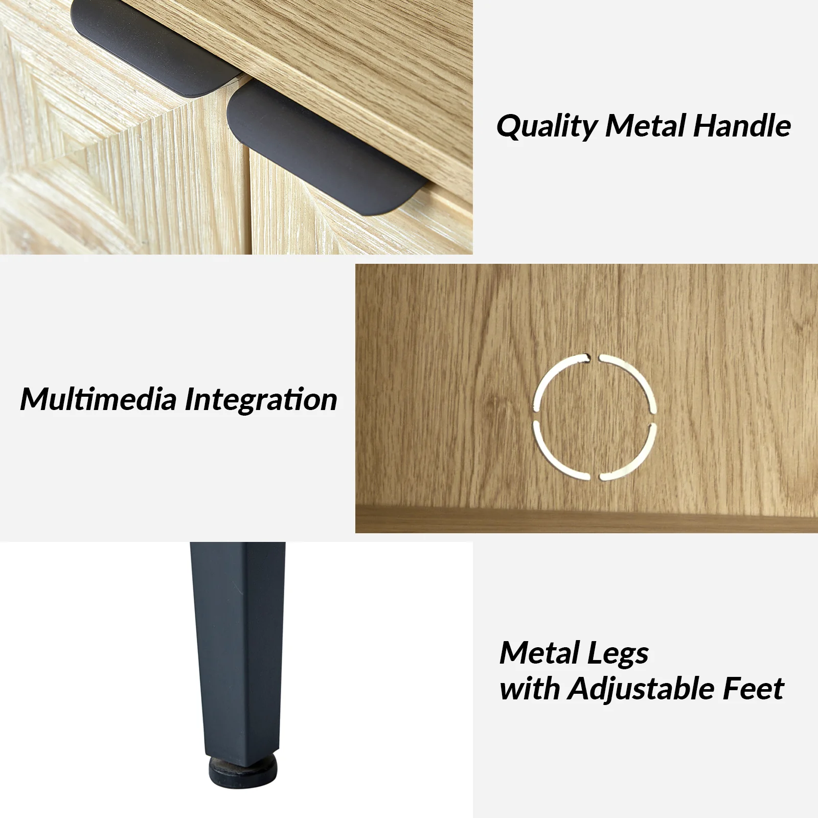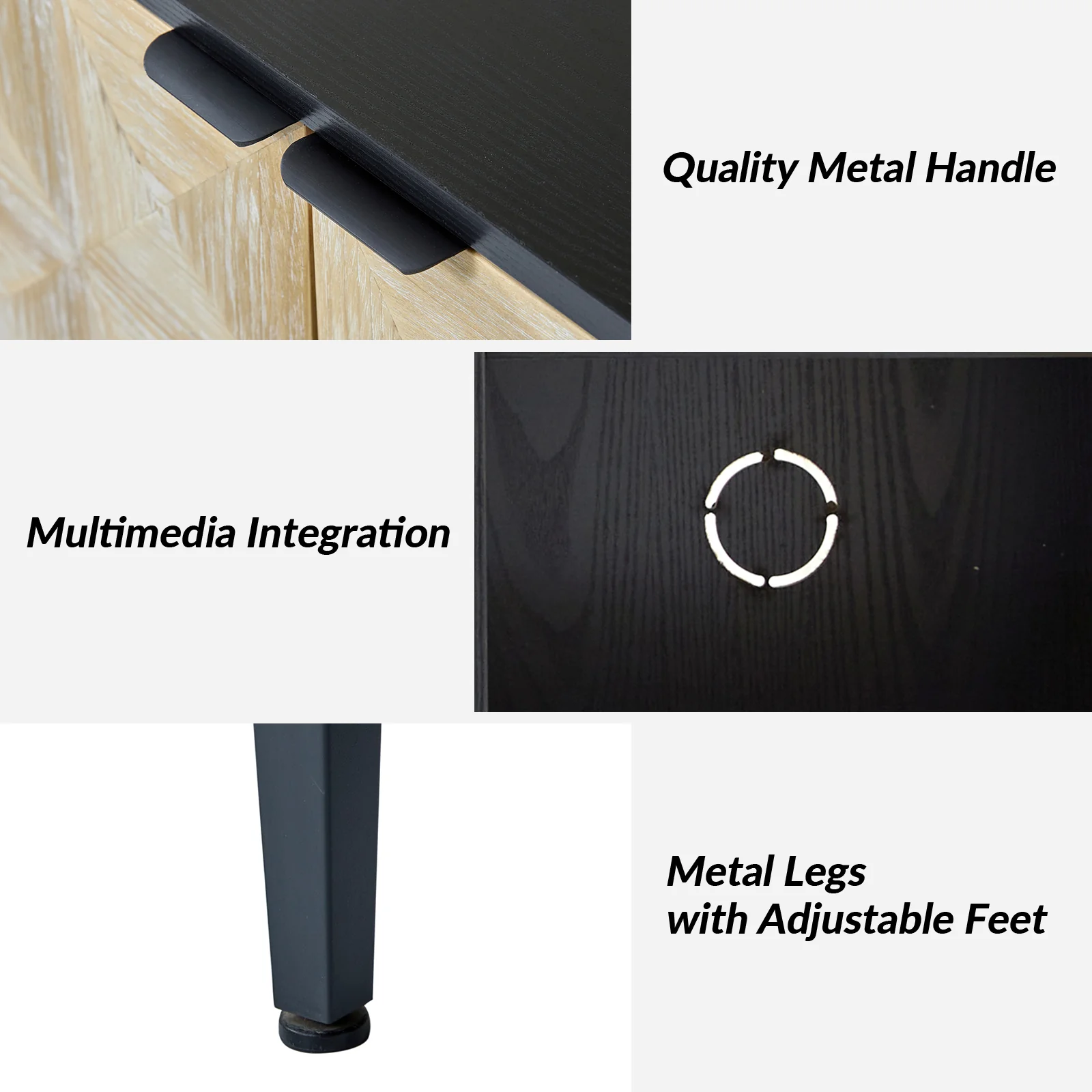 Unveiling a chic modern 4-door sideboard that merges style and functionality. Embracing contemporary aesthetics, its door panels showcase captivating pyramid patterns, forming a sleek grid of three-dimensional facades for a sophisticated touch. With six adjustable shelves, it offers diverse storage options, allowing you to tailor the interior to your organizational preferences. Plus, this sideboard features a built-in multimedia hole, seamlessly integrating electronic devices for convenience and aesthetic appeal. The iron strip handles enhance the visual allure and ensure a secure grip for easy access. Supported by metal legs with adjustable feet, it adapts seamlessly to different surfaces. Elevate your space with this sideboard, where style effortlessly meets practicality.