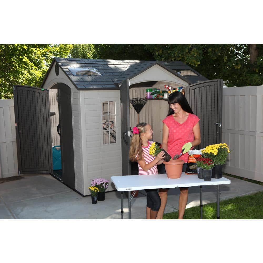 The 10 ft. wide Sheds from Lifetime Products give you that extra space needed while accenting the beauty of your backyard. The centralized location of the doors provides easy storage access and the decorative shutters, molded wood-grain panels, and simulated shingled roof ensure an attractive design that will be the envy of your neighborhood. Floor and installation hardware included.